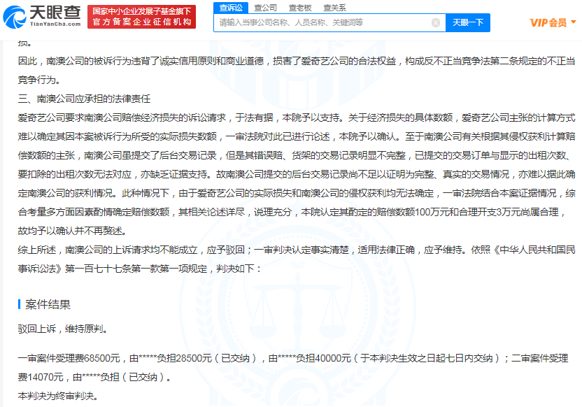 近日,湖南南澳网络科技有限公司与北京爱奇艺科技有限公司不正当竞争纠纷二审法律文书公开。