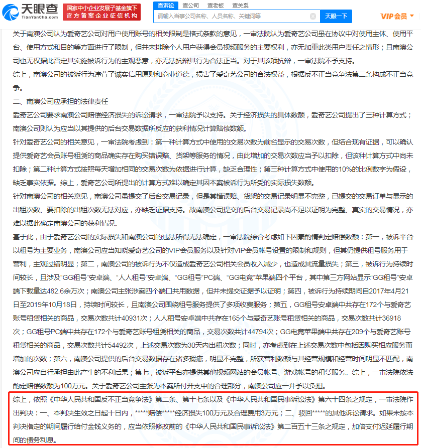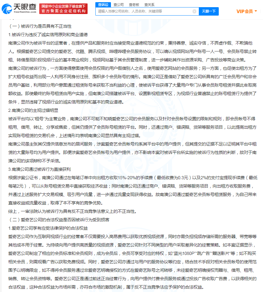 文书显示,一审原告爱奇艺公司诉称,南澳公司在其运营的多个租号平台中向用户收费提供爱奇艺会员账号的租赁服务,并从中获取高额利益。被告南澳公司诉称,涉案爱奇艺账号为用户上传,其主营业务为游戏账号租赁,视频账号租赁占比小,不会对爱奇艺的经营产生影响等。