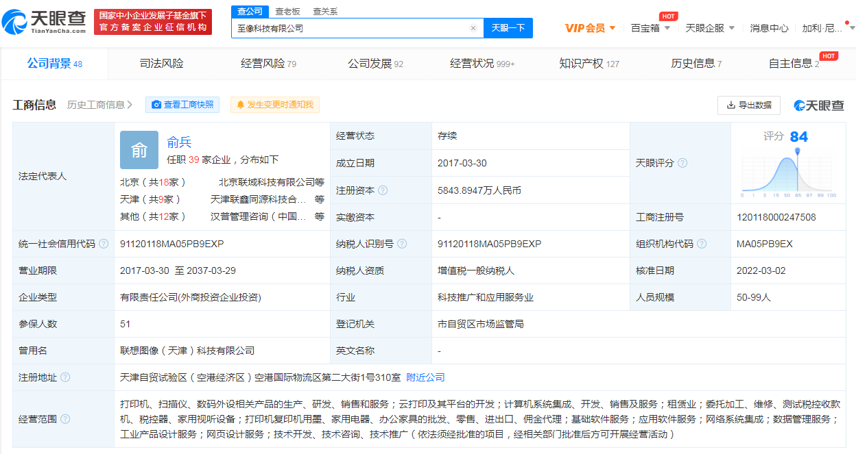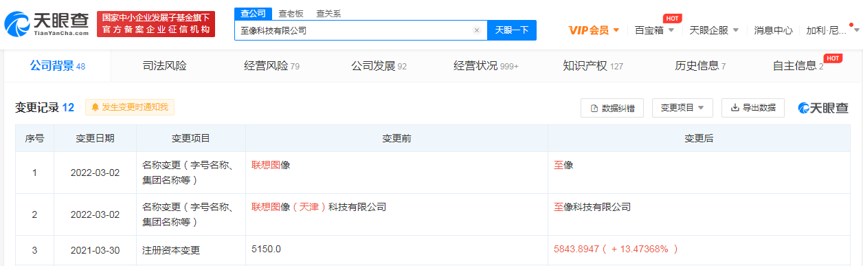 近日,原联想图像(天津)科技有限公司发生工商变更,企业名称变更为至像科技有限公司,注册资本增至约5843.89万人民币。