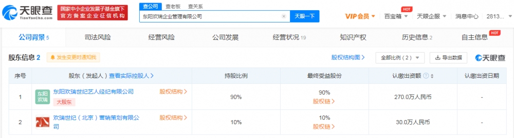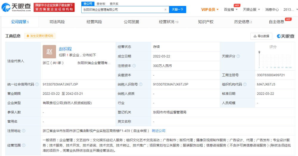 近日,东阳欢瑞企业管理有限公司成立,注册资本300万人民币,法定代表人为赵枳程,经营范围含企业管理;文艺创作;文化娱乐经纪人服务;组织文化艺术交流活动等。股东信息显示,该公司由东阳欢瑞世纪艺人经纪有限公司、欢瑞世纪(北京)营销策划有限公司共同持股。