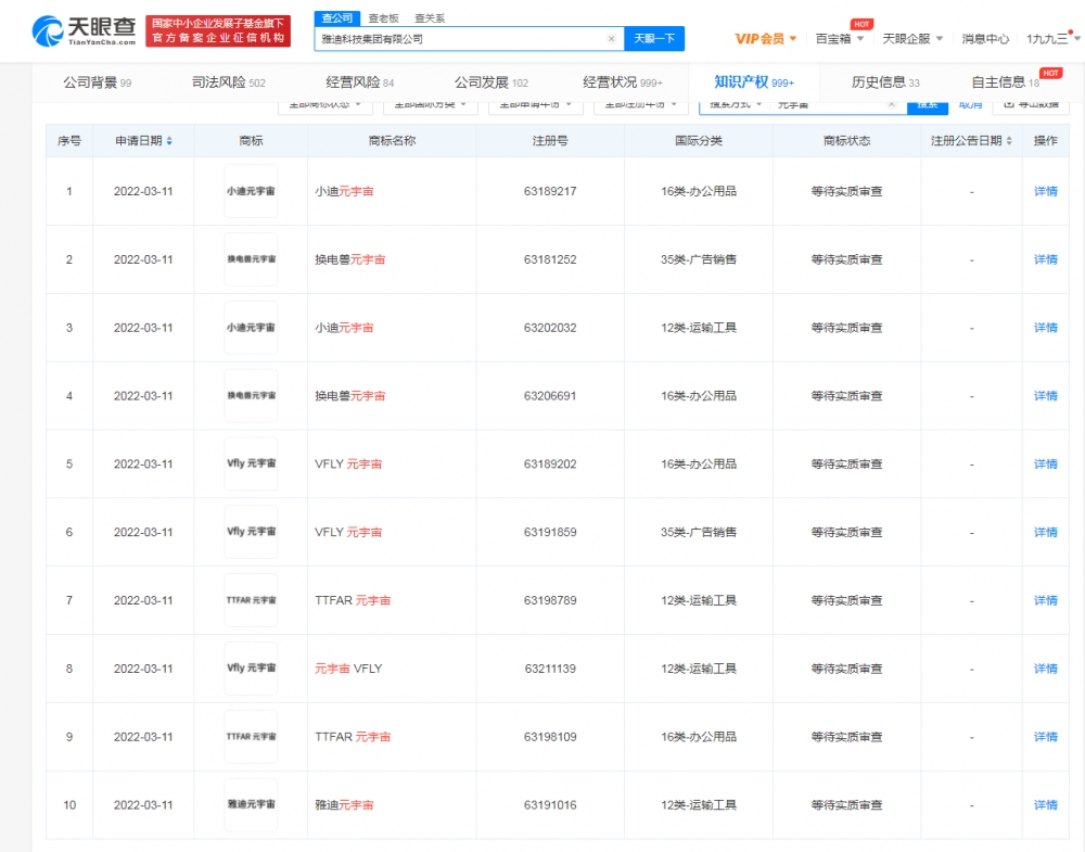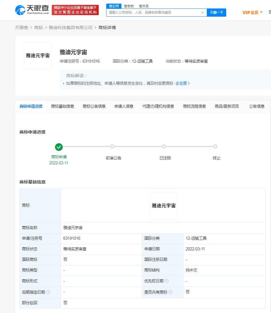据相关显示,近日,雅迪科技集团有限公司申请注册“ 雅迪元宇宙”“小迪元宇宙”“换电兽元宇宙”“VFLY 元宇宙”“TTFAR 元宇宙”等商标,国际分类包括运输工具、广告销售等,当前商标状态为等待实质审查。