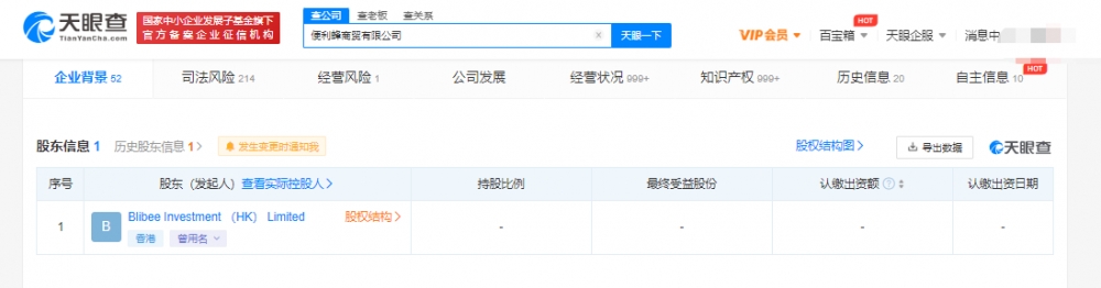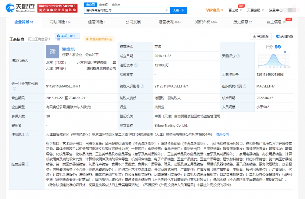 便利蜂商贸有限公司成立于2016年11月,法定代表人为谢维恺,经营范围包括通讯设备销售;票务代理服务;办公服务;信息咨询服务等。股东信息显示,该公司由Blibee Investment (HK) Limited全资控股。