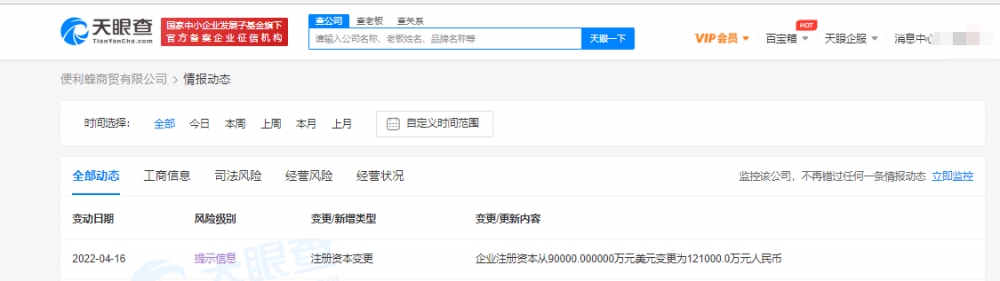 据相关显示,近日,便利蜂商贸有限公司发生工商变更,公司注册资本由9亿美元增加至12.1亿美元。