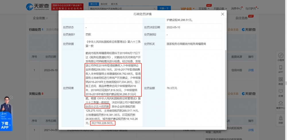 天眼查App显示,近日,鹤岗市洪河房地产开发有限公司因偷逃税被国家税务总局鹤岗市税务局稽查局罚款约76.3万元。