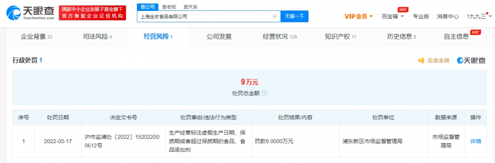 天眼查App显示,近日,上海金亥食品有限公司和上海远瑞果业有限公司作为疫情防控生活物资保障企业,分别因销售超过保质期的咸碎肉和大米,被罚款9万和1.5万。