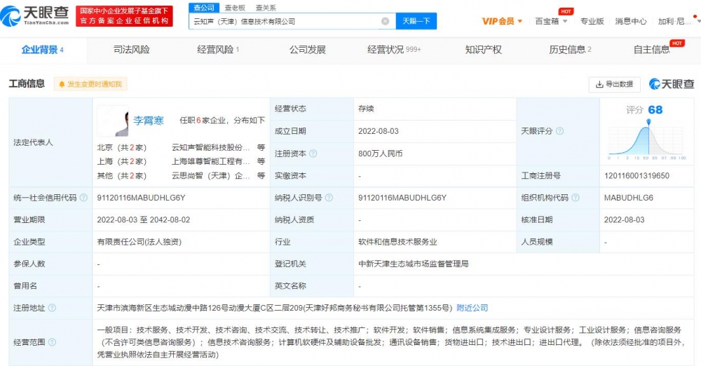 天眼查App显示,近日,云知声(天津)信息技术有限公司成立,法定代表人为李霄寒,注册资本800万人民币,经营范围包括软件开发;软件销售;信息系统集成服务;工业设计服务;信息技术咨询服务;进出口代理等。股东信息显示,该公司由云知声智能科技股份有限公司全资控股。