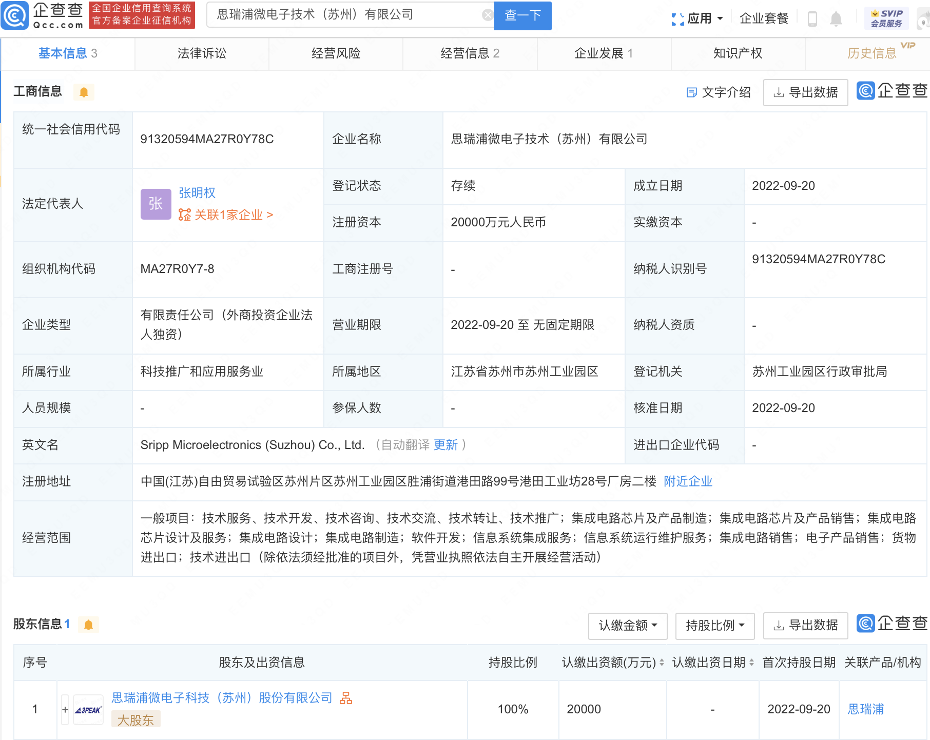 企查查APP显示,近日,思瑞浦微电子技术(苏州)有限公司成立,法定代表人为张明权,注册资本2亿元人民币,经营范围包含:集成电路芯片及产品制造;集成电路芯片及产品销售;集成电路芯片设计及服务;集成电路设计;集成电路制造等。企查查股权穿透显示,该公司由思瑞浦(688536)100%控股。