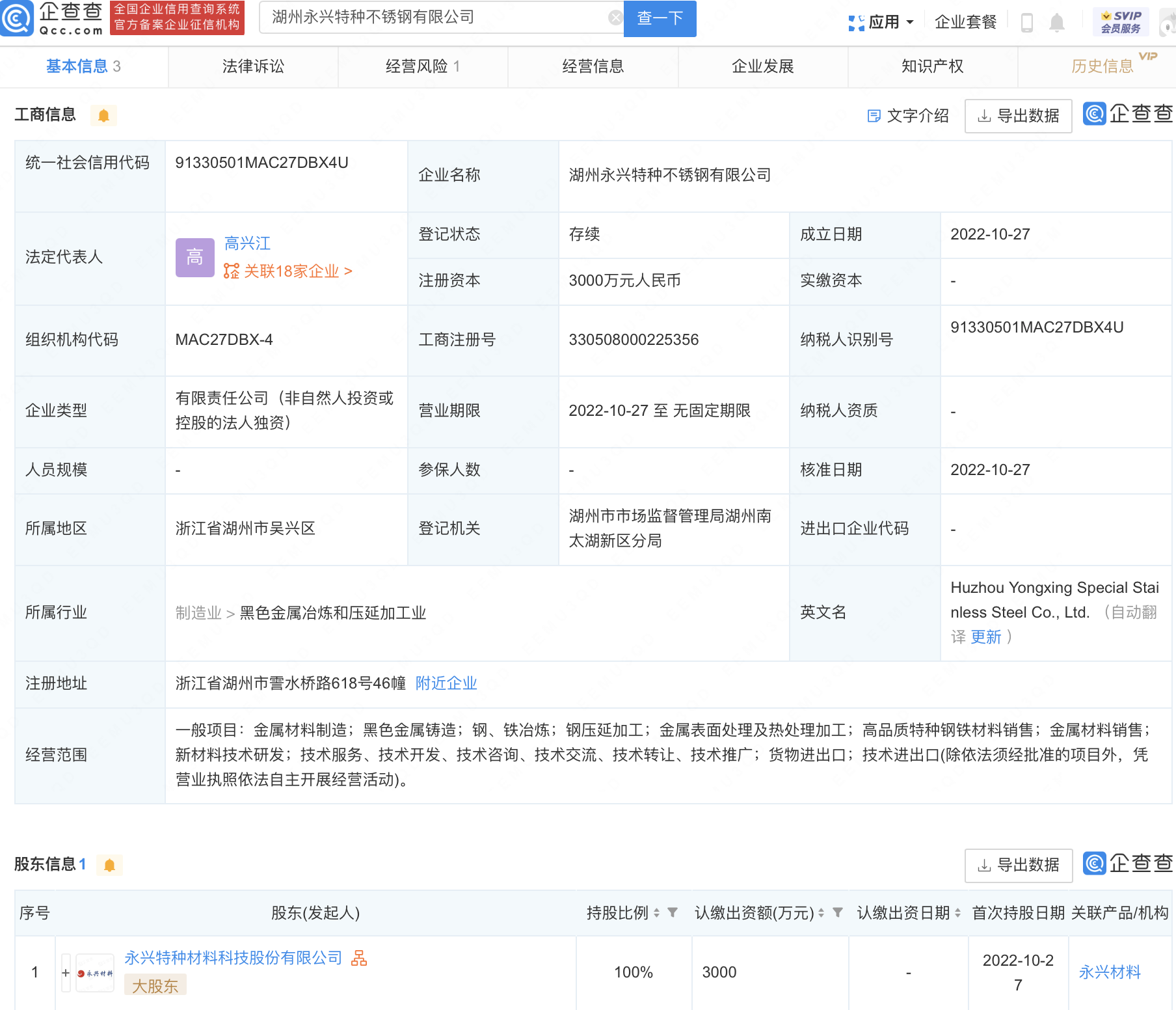 企查查APP显示,近日,湖州永兴特种不锈钢有限公司成立,法定代表人为高兴江,注册资本3000万元人民币,经营范围包含:金属材料制造;黑色金属铸造;钢、铁冶炼;钢压延加工;金属表面处理及热处理加工等。企查查股权穿透显示,该公司由永兴材料(002756)100%控股。