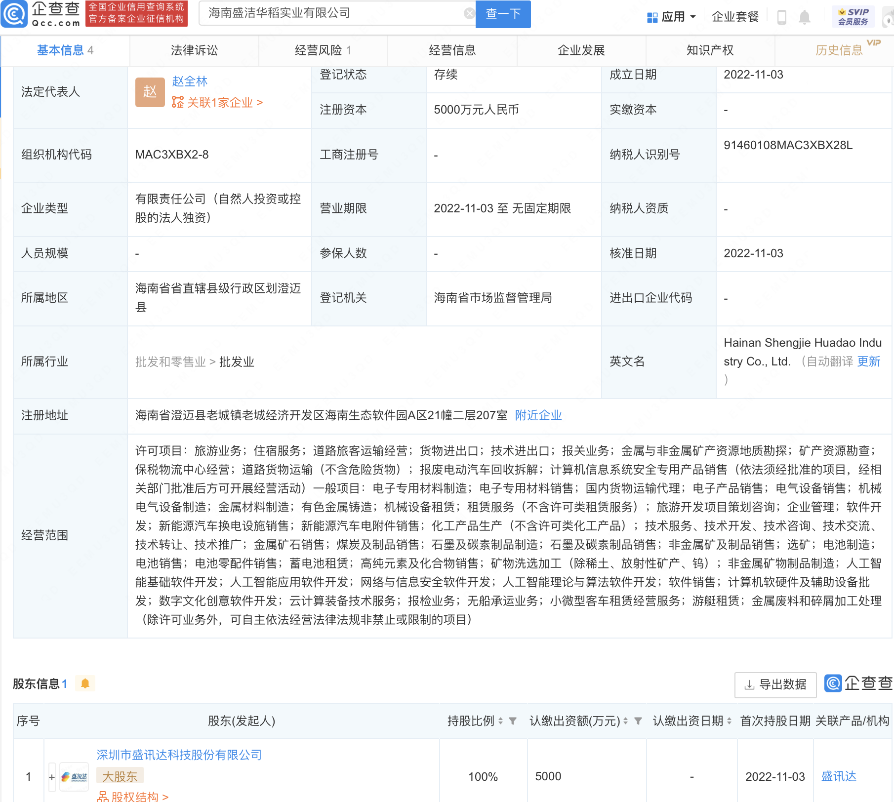 企查查APP显示,近日,海南盛洁华稻实业有限公司成立,法定代表人为赵全林,注册资本5000万元人民币,经营范围包含:石墨及碳素制品制造;电池制造;蓄电池租赁;小微型客车租赁经营服务等。企查查股权穿透显示,该公司由盛讯达(300518)100%控股。