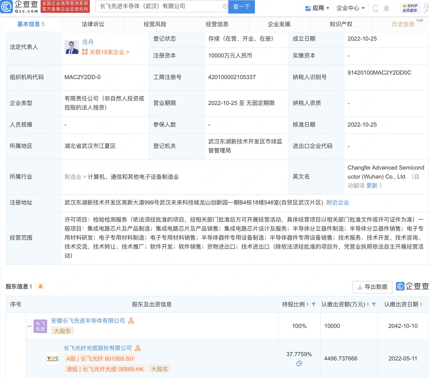 企查查APP显示,近日,长飞先进半导体(武汉)有限公司成立,法定代表人为庄丹,注册资本1亿元人民币,经营范围包含:集成电路芯片及产品制造;集成电路芯片及产品销售;半导体分立器件制造;半导体分立器件销售等。企查查股权穿透显示,该公司由长飞光纤(601869)等间接共同持股。
