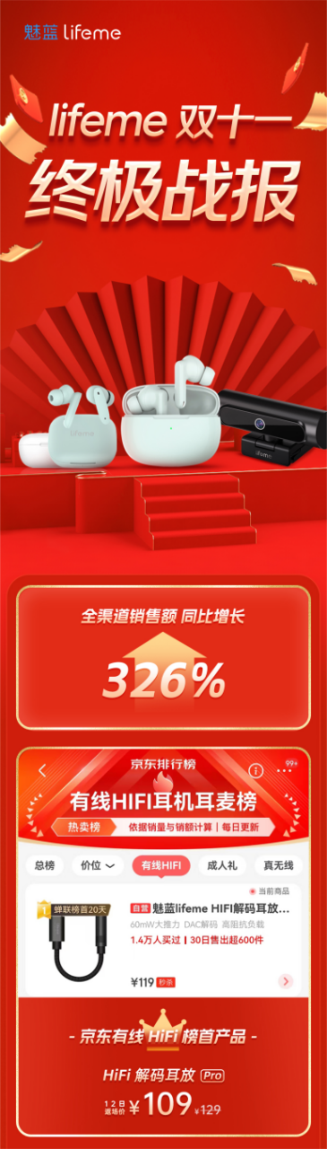 DoNews11月12日消息,魅蓝科技官方公布了魅蓝lifeme双11战报,据战报显示,魅蓝 lifeme 全渠道销售额同比增长326%;同时,魅蓝 lifeme HiFi解码耳放Pro 荣登京东有线HiFi耳机耳麦榜Top 1。
