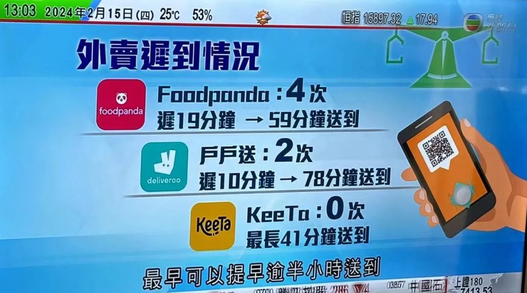 近日,美团香港外卖业务KeeTa在中国香港特别行政区消费者委员会进行的一项外卖平台实测中,履约表现拔得头筹,送餐准时度大幅领先同业。香港消委会测评发现,受制于香港高昂的人力成本和履约模式,被测评的6个外卖平台(户户送Deliveroo、Foodpanda、KeeTa、肯德基KFC、麦麦送McDelivery、必胜客Pizza Hut)送餐时间参差不齐。