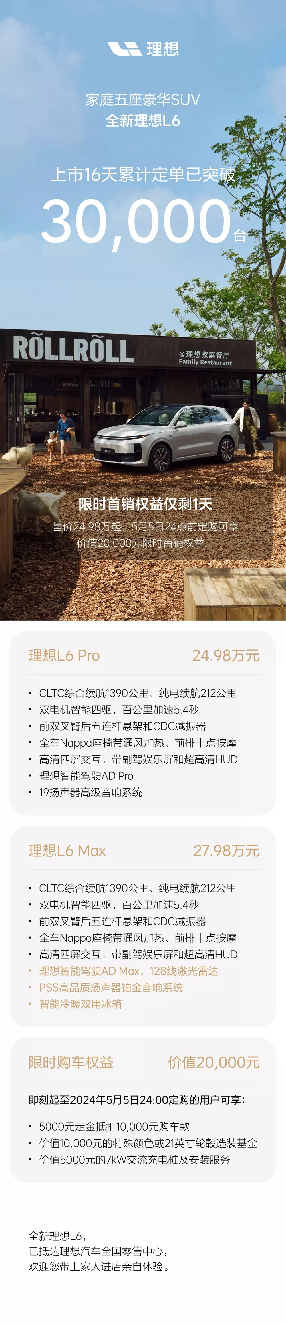 理想汽车宣布全新理想 L6 车型上市 16 天累计订单突破 30,000 台,并推出限时购车权益。理想 L6 车身尺寸为 4925mm x 1960mm x 1735mm,轴距 2920mm,配置包括 15.7 英寸双联屏、骁龙 8295P 处理器、19 扬声器等。