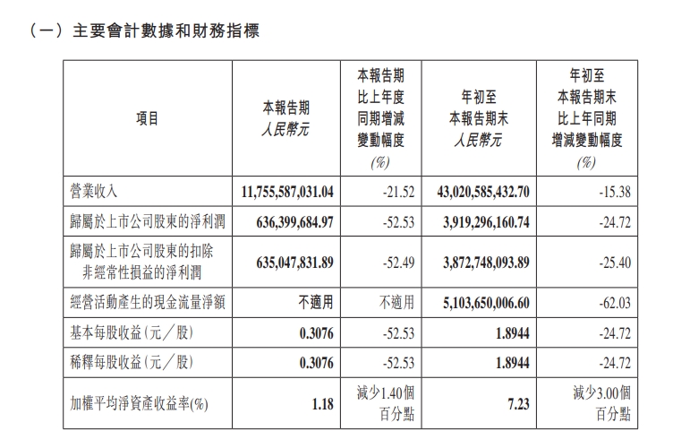 中国中免前三季度营业收入约 430.21 亿元,同比减少 15.38%。归母净利润约 39.19 亿元,同比减少 24.72%。第三季度营业收入约 117.56 亿元,同比减少 21.52%。归母净利润约 6.36 亿元,同比减少 52.53%。