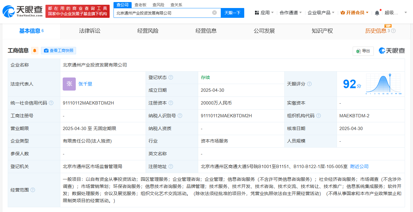 天眼查App显示,近日,北京通州产业投资发展有限公司成立,法定代表人为张千里,注册资本2亿,经营范围包括以自有资金从事投资活动、园区管理服务、企业管理咨询、企业管理等。股东信息显示,该公司由北京通州发展集团有限公司全资持股。