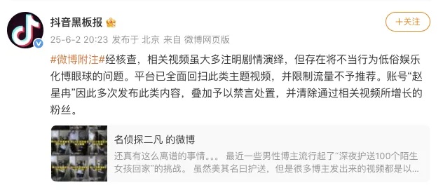 抖音黑板报2日晚间发布相关处理进展:经核查,相关视频虽大多注明剧情演绎,但存在将不当行为低俗娱乐化博眼球的问题。平台已全面回扫此类主题视频,并限制流量不予推荐。账号“赵星冉”因此多次发布此类内容,叠加予以禁言处置,并清除通过相关视频所增长的粉丝。