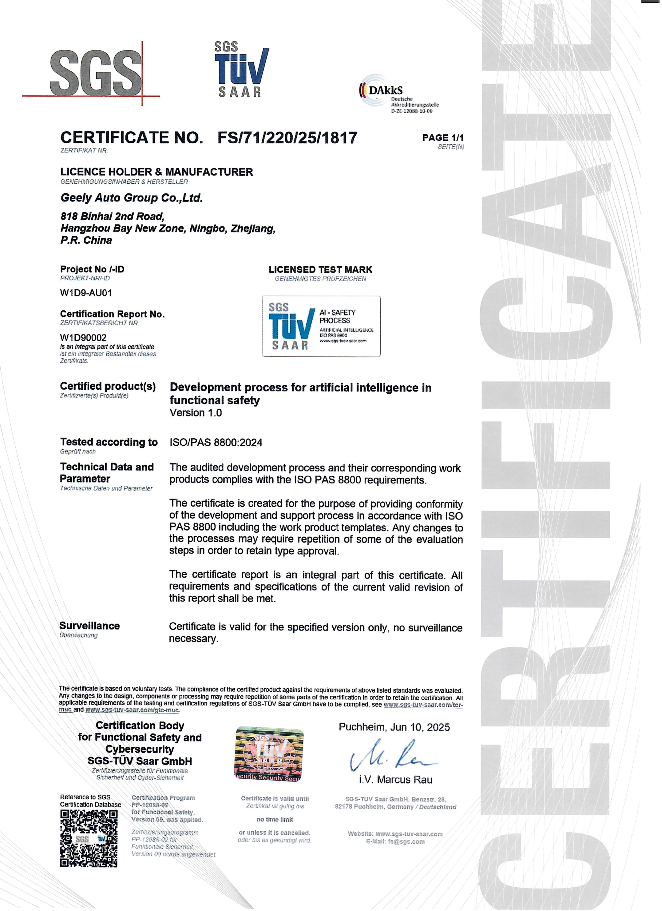 ISO/PAS 8800是国际标准化组织(ISO)于2024年12月发布的全球首个针对道路车辆领域的人工智能安全的权威标准。吉利汽车凭借全球领先的全域安全体系,顺利通过欧盟SGS审核,获得欧洲DAkkS的权威认证。