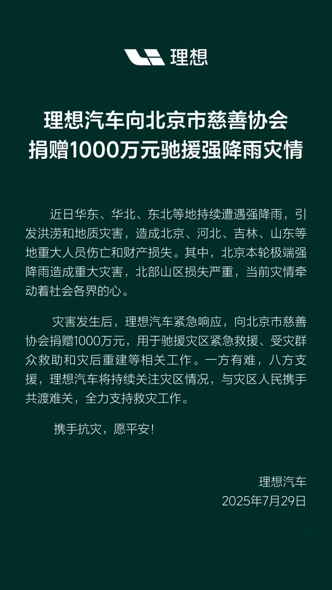 理想汽车向北京市慈善协会捐赠1000万元驰援强降雨灾情