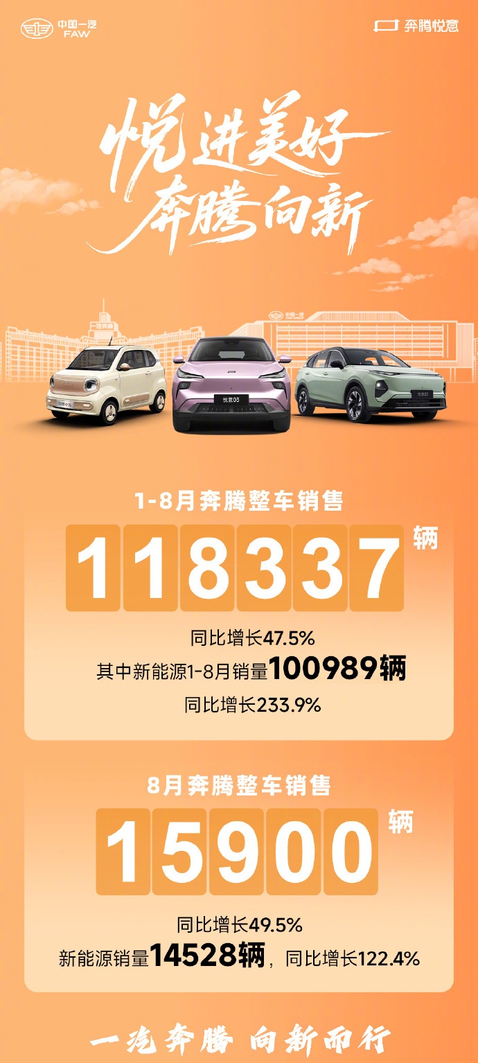 一汽奔腾8月销量15900辆。