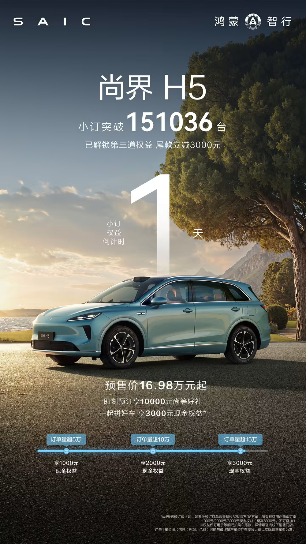 尚界汽车官方微博刚刚宣布,尚界 H5 小订突破 15 万台(151036 台)。
