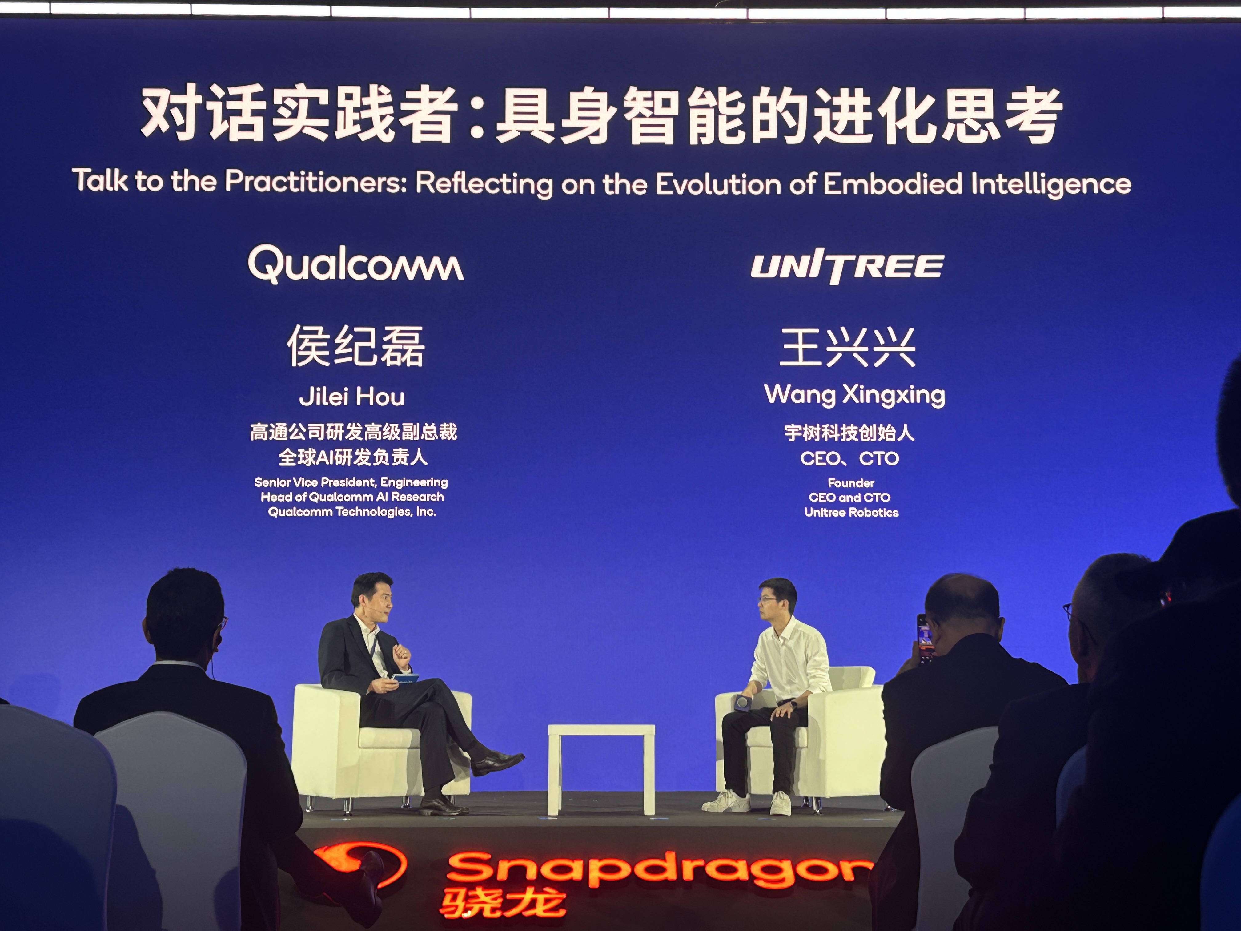 在2025高通骁龙峰会上,高通公司研发高级副总裁、全球AI研发负责人侯纪磊与宇树科技创始人CEO王兴兴展开了一场对话,分享了对具身智能及人形机器人产业发展的最新思考和判断。
