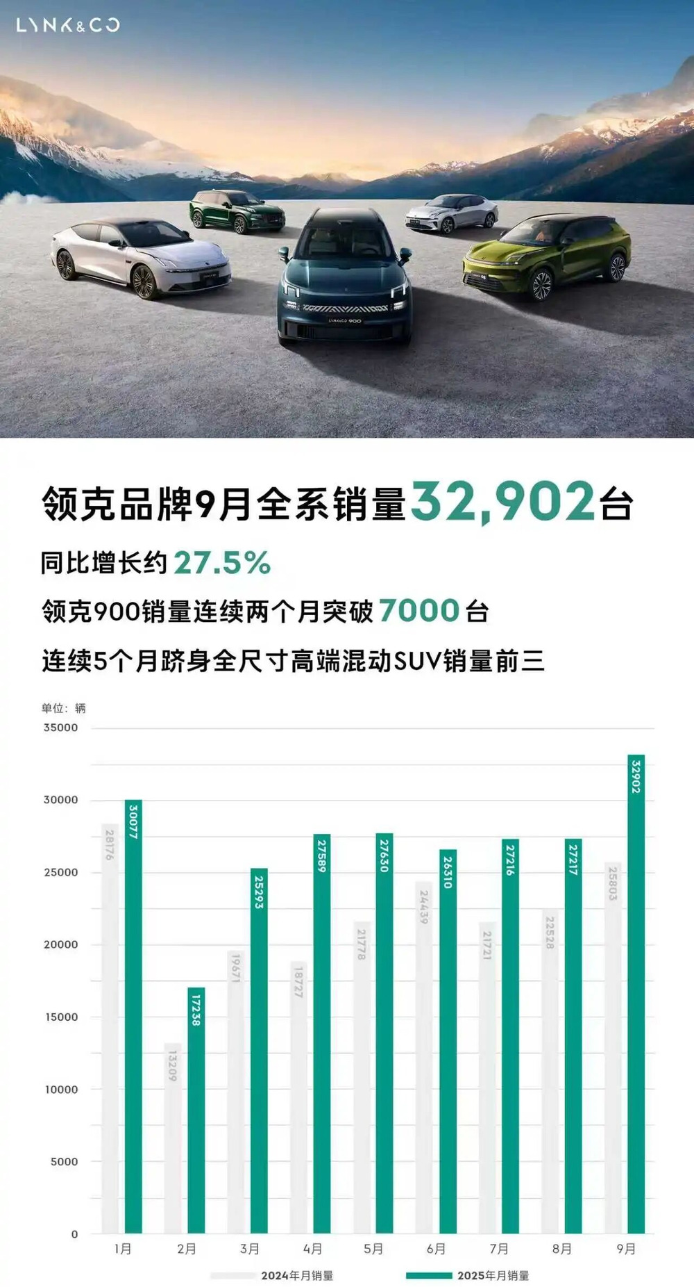 2025年9月,领克品牌全系销量32,902台,环比增长约20.9%,同比增长约27.5%。其中,领克新能源车型占比约79.3%,创历史新高。2025年1-9月,领克品牌全系累计销量达241,472台,同比增长超23.5%。