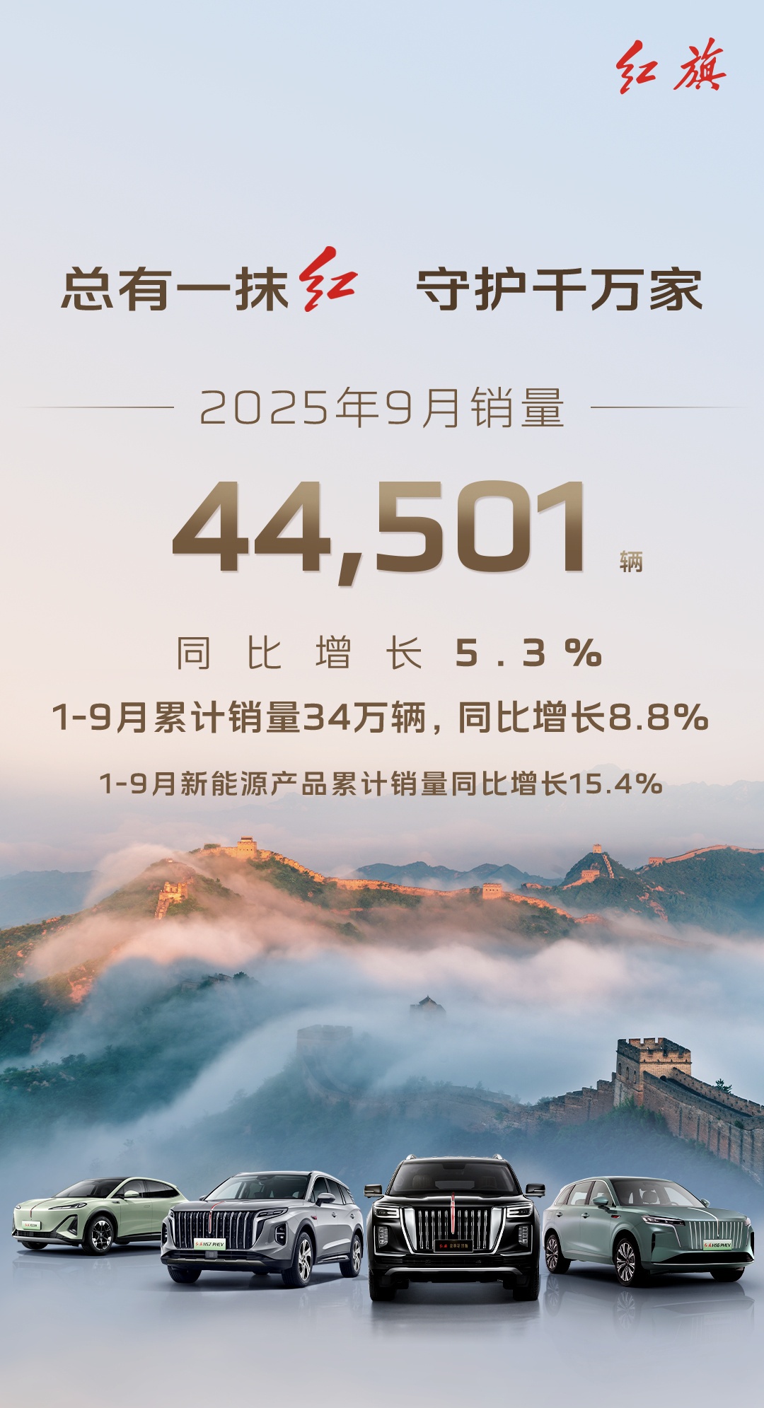 一汽红旗:9 月份红旗品牌单月销量突破 4.45 万辆,同比增长 5.3%;1-9 月累计销量 34 万辆,同比增长 8.8%。其中,红旗新能源产品 1-9 月累计销量同比增长 15.4%,红旗金葵花产品 1-9 月累计销量同比增长 28.3%。
