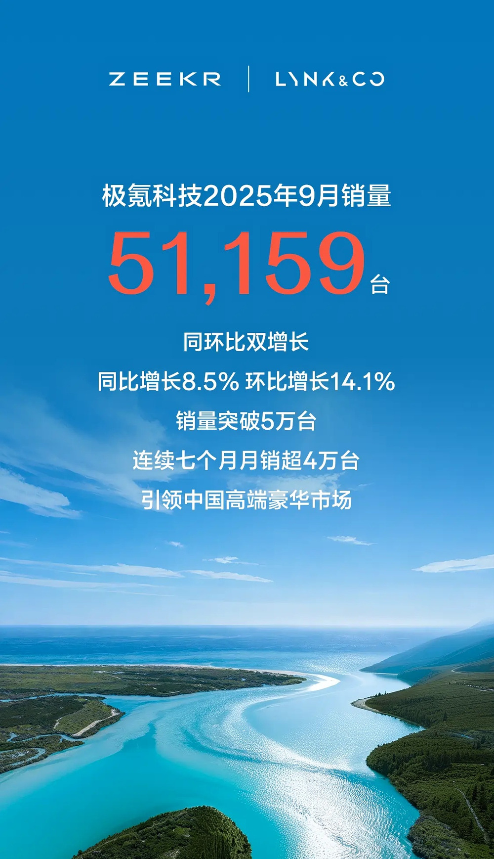 极氪汽车:9 月交付 51159 辆,同比增长 8.5%