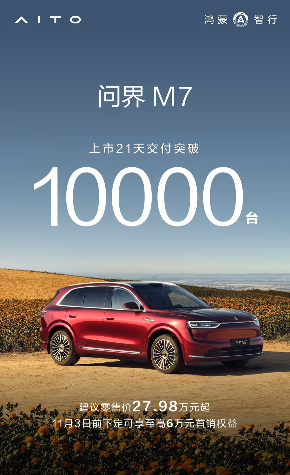 全新问界 M7 汽车上市 21 天交付突破 10000 台