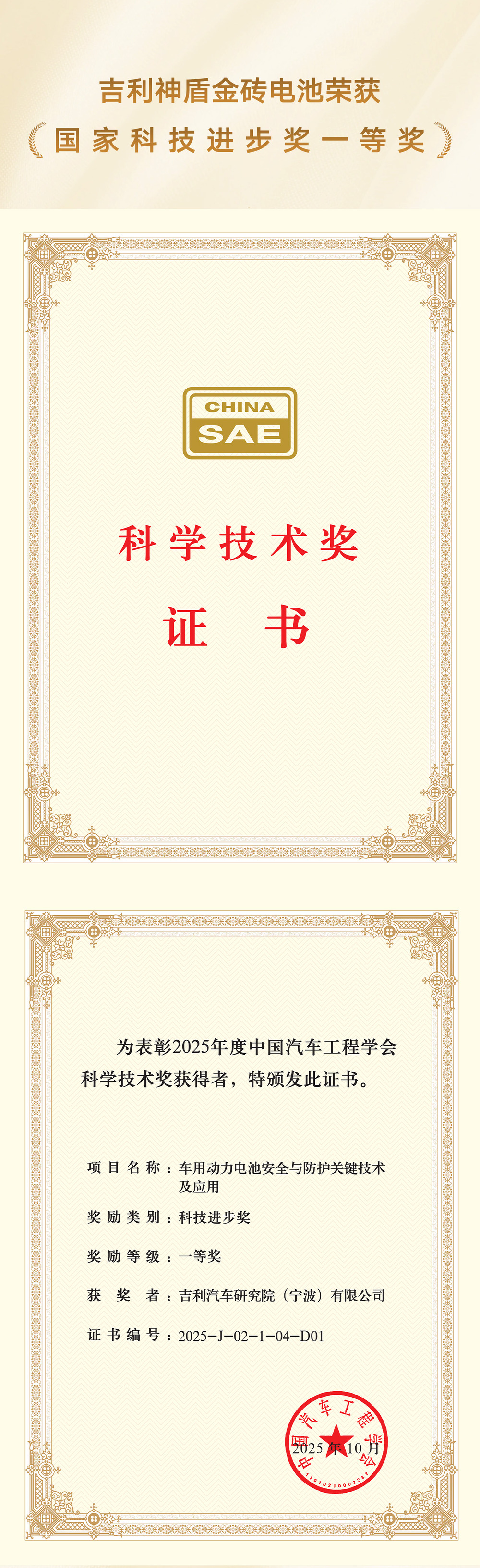10月22日,吉利汽车“车用动力电池安全与防护关键技术及应用”项目,荣获2025年度“中国汽车工程学会科学技术奖”科技进步奖一等奖。该成果通过多项创新设计,实现了动力电池在全场景下的极致安全,目前已全面应用于神盾金砖电池系列产品。