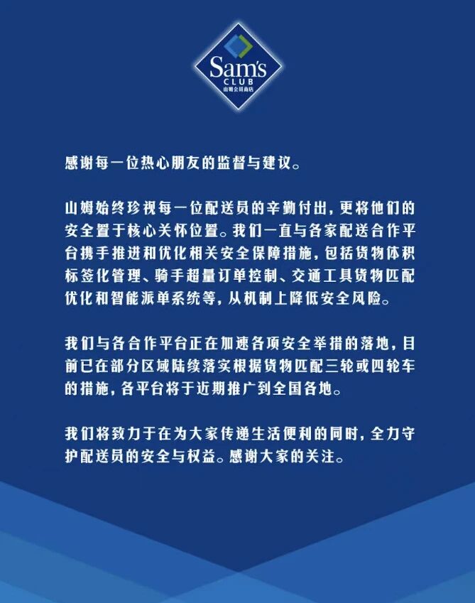 事件发酵后,不少人对山姆进行吐槽,认为山姆作为国外的知名企业,不应该这样压榨配送员。10月22日,山姆对此回应称:“公司与各合作平台正在加速各项安全举措的落地,目前已在部分区域陆续落实根据货物匹配三轮或四轮车的措施,各平台将于近期推广到全国各地。”近期山姆在天津、武汉、长沙等地已与顺丰、京东合作,用电动三轮车的方式运输大件货物。