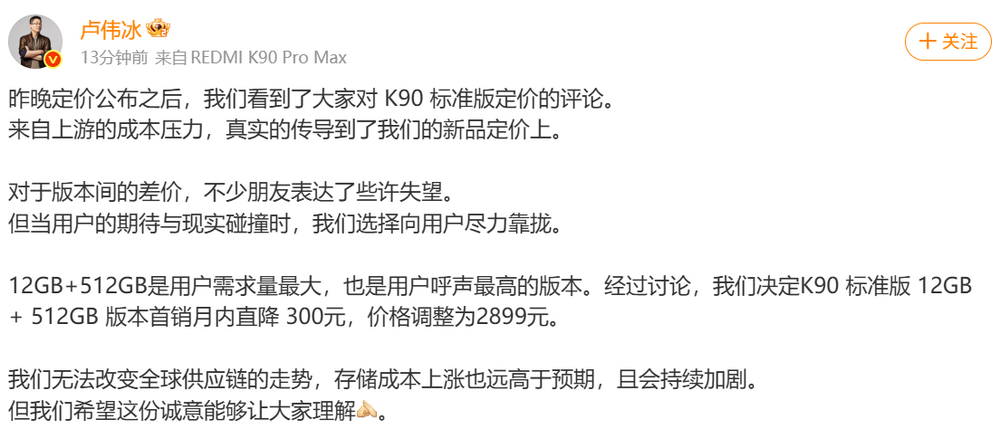 小米 REDMI 旗下 K90 标准版手机于昨天发布,今天小米宣布该机 12GB RAM + 512GB 版本迎来调价,原价 3199 元,首销月直降 300 元后,到手价 2899 元(该价格和“16GB RAM + 256GB 版本”相同)。