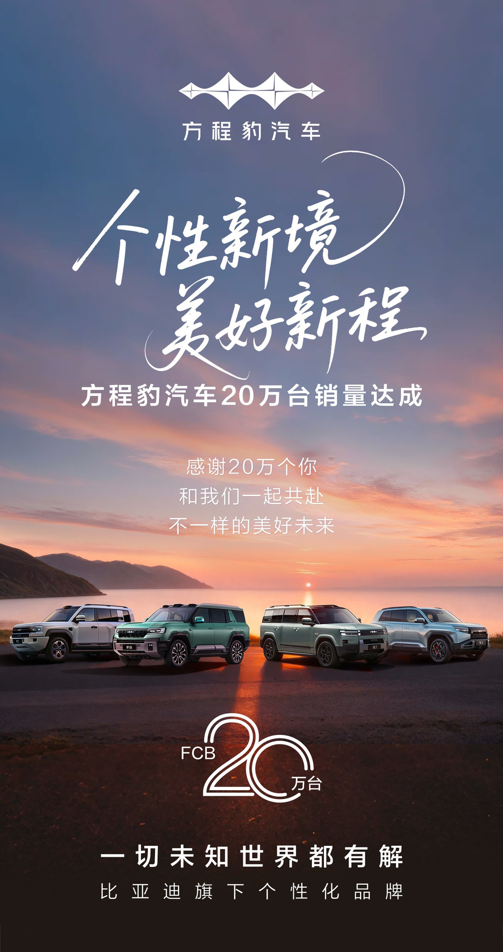 据方程豹汽车官微消息,方程豹汽车 20 万台销量达成,新势力品牌增速 TOP3,品牌平均成交价 23.88 万。