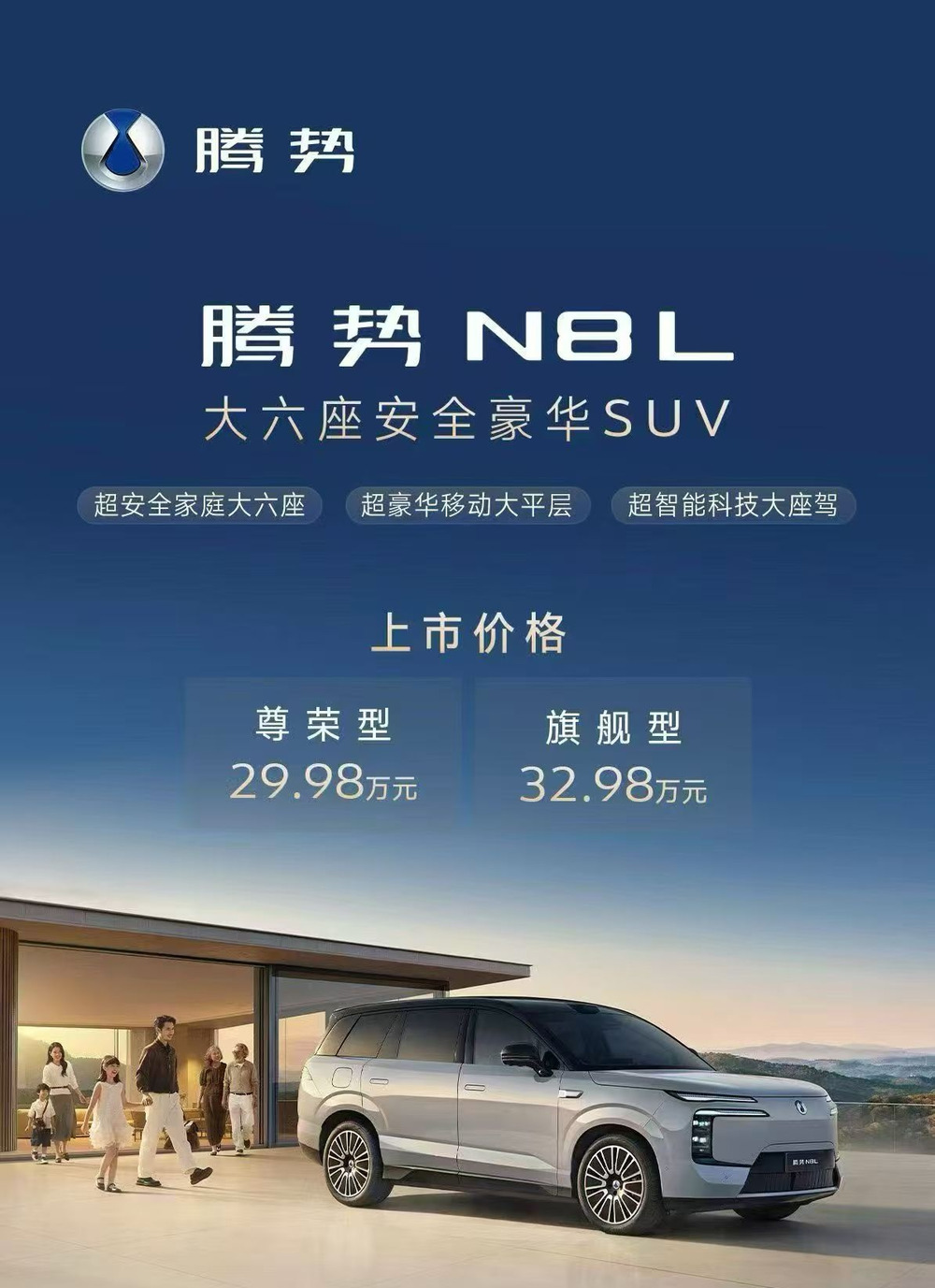 比亚迪腾势 N8L 今日宣布正式上市,定位“大六座安全豪华 SUV”,号称“科技出行移动空间”,官方指导价 29.98 万元起。