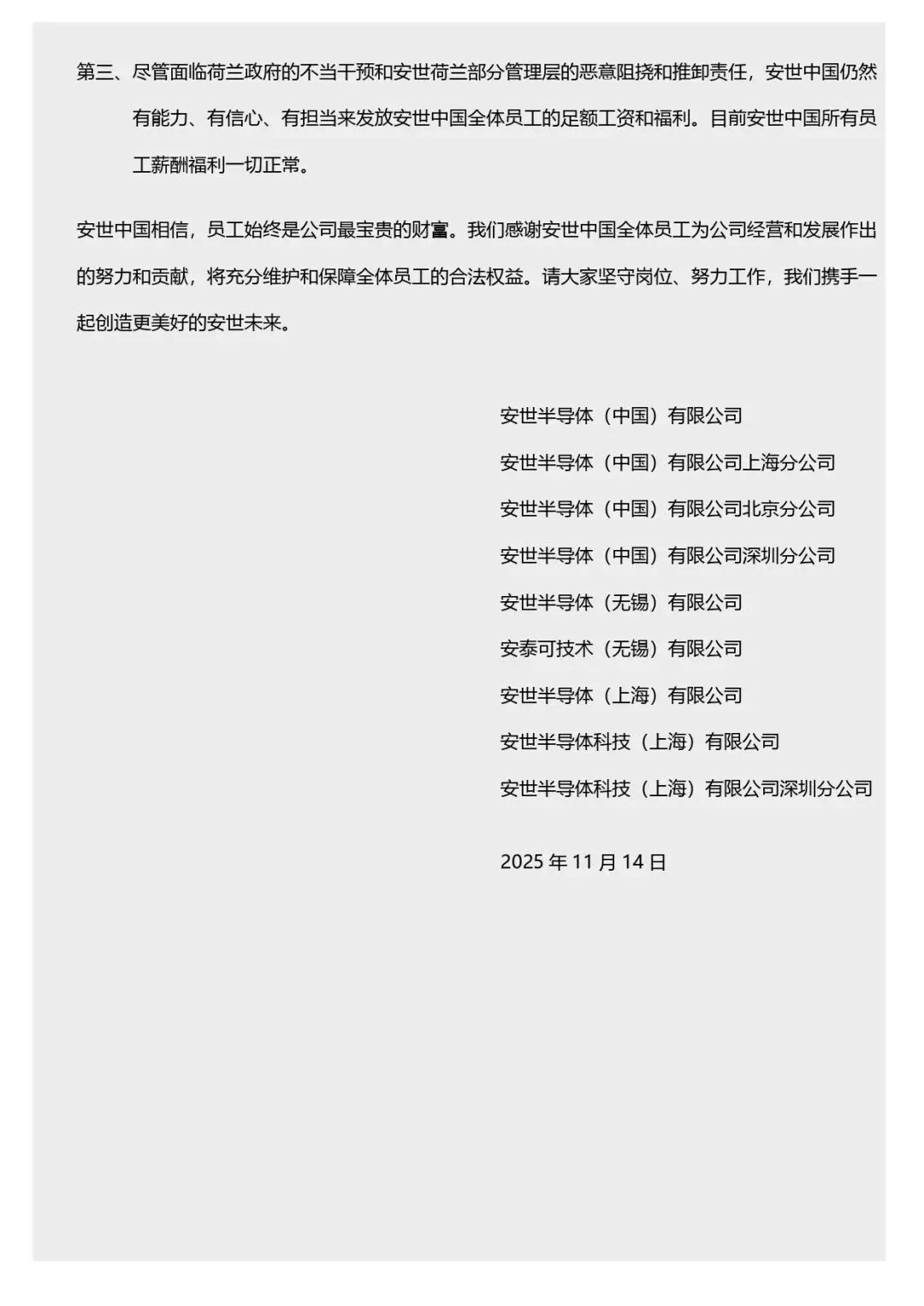 安世中国11月14日发布全员信,信中称,尽管面临荷兰政府的不当干预和安世荷兰部分管理层的恶意阻挠和推卸责任,安世中国仍然有能力、有信心、有担当来发放安世中国全体员工的足额工资和福利。目前安世中国所有员工薪酬福利一切正常。
