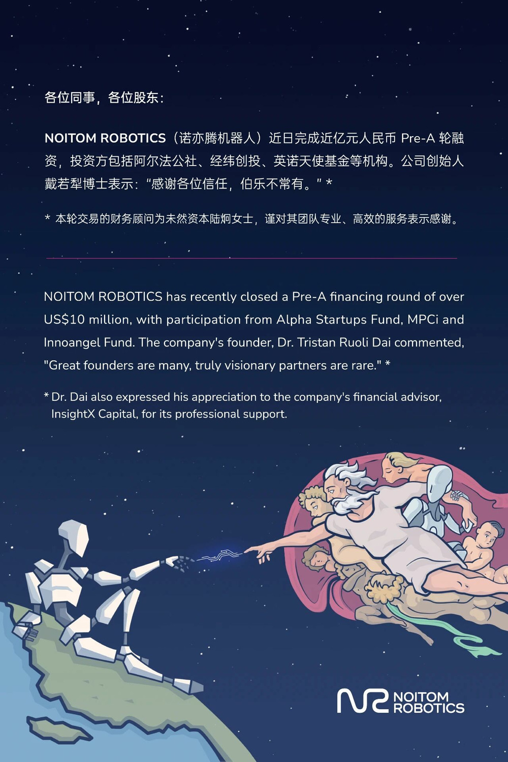 NOITOM ROBOTICS(诺亦腾机器人) 宣布近日完成近亿元人民币 Pre-A 轮融资,投资方包括阿尔法公社、经纬创投、英诺天使基金等机构。