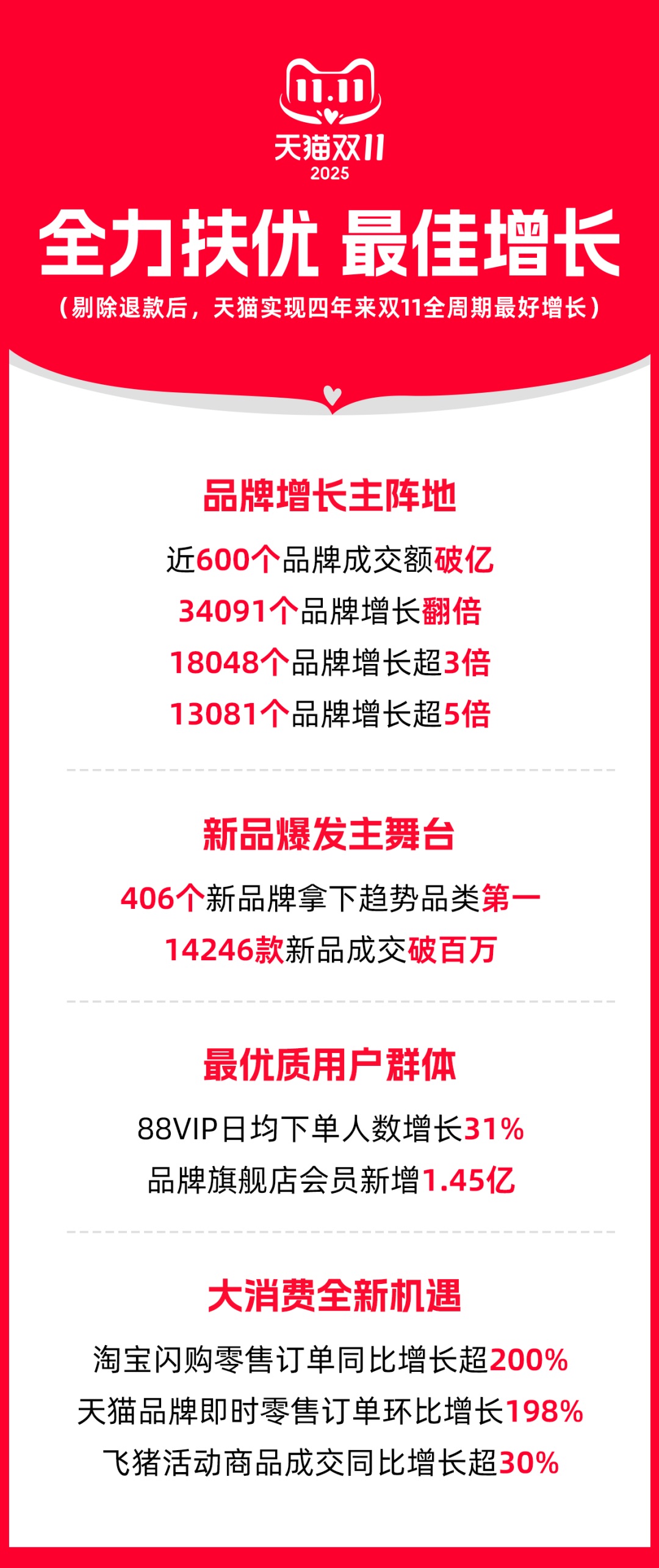 天猫总裁家洛表示:“在扶持优质品牌和原创商家的战略带动下,同时得益于平台史上力度最大的消费者投资,天猫实现了四年以来双11全周期最好的一次增长(剔除退款后成交)。”