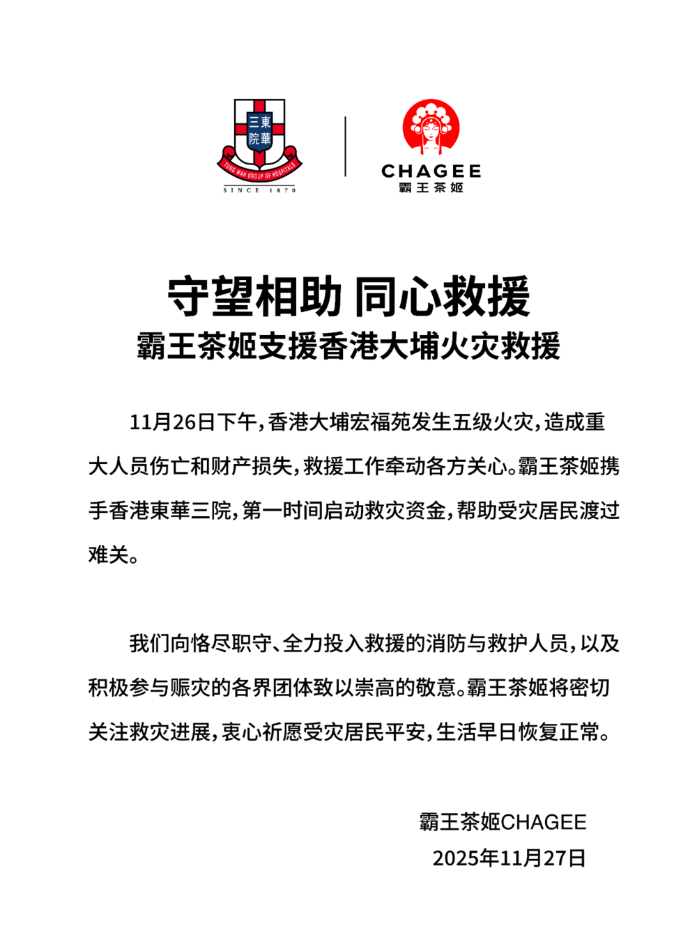 霸王茶姬支援香港大埔火灾救援。