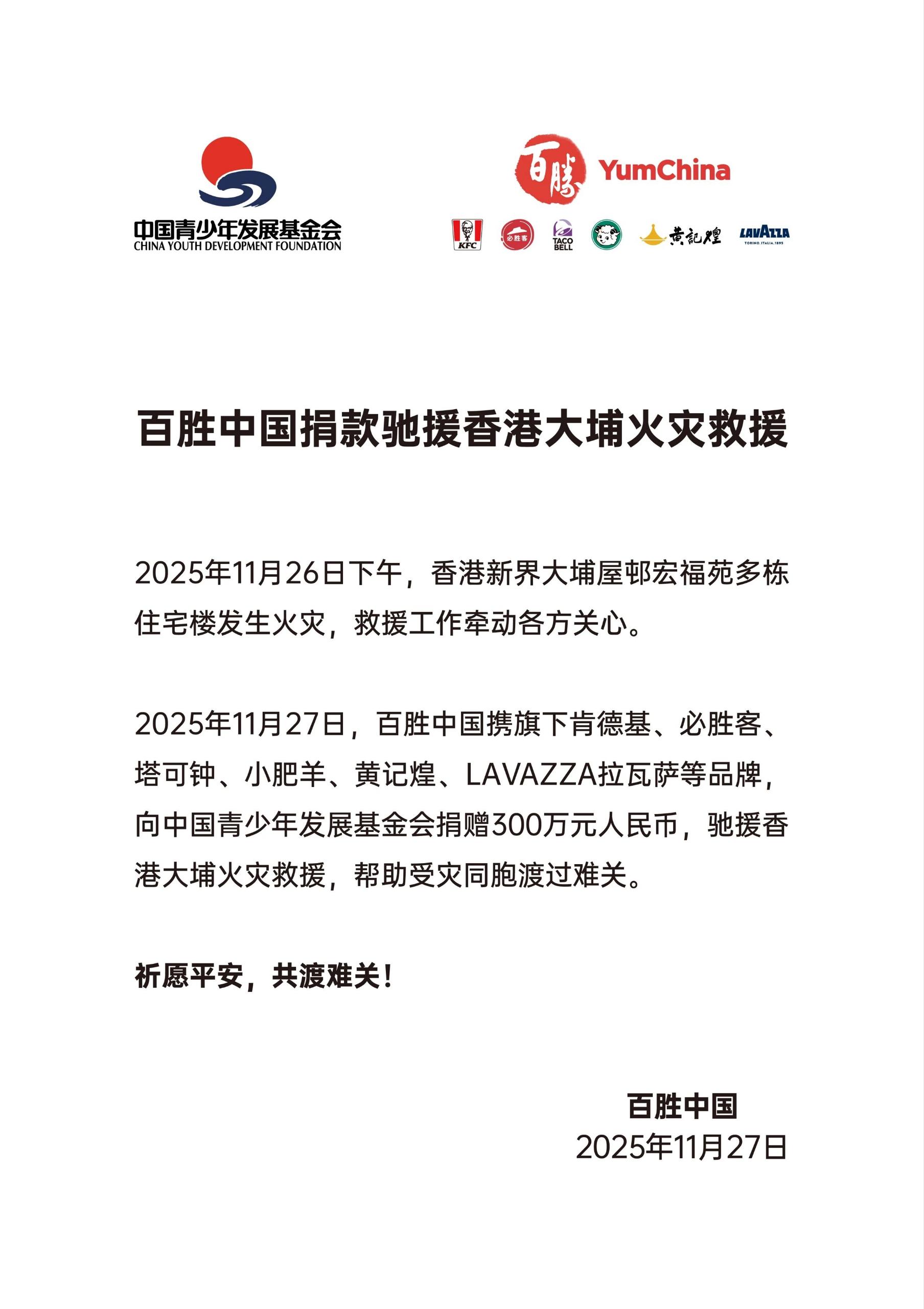百胜中国捐款300万元人民币驰援香港大埔火灾救援