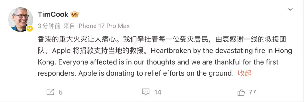 今天下午,苹果公司 CEO 库克在微博用中英文发文称,香港的重大火灾令人痛心。库克表达了对受灾居民的牵挂和对一线救援团队的感谢,并宣布苹果将捐款支持当地救援。