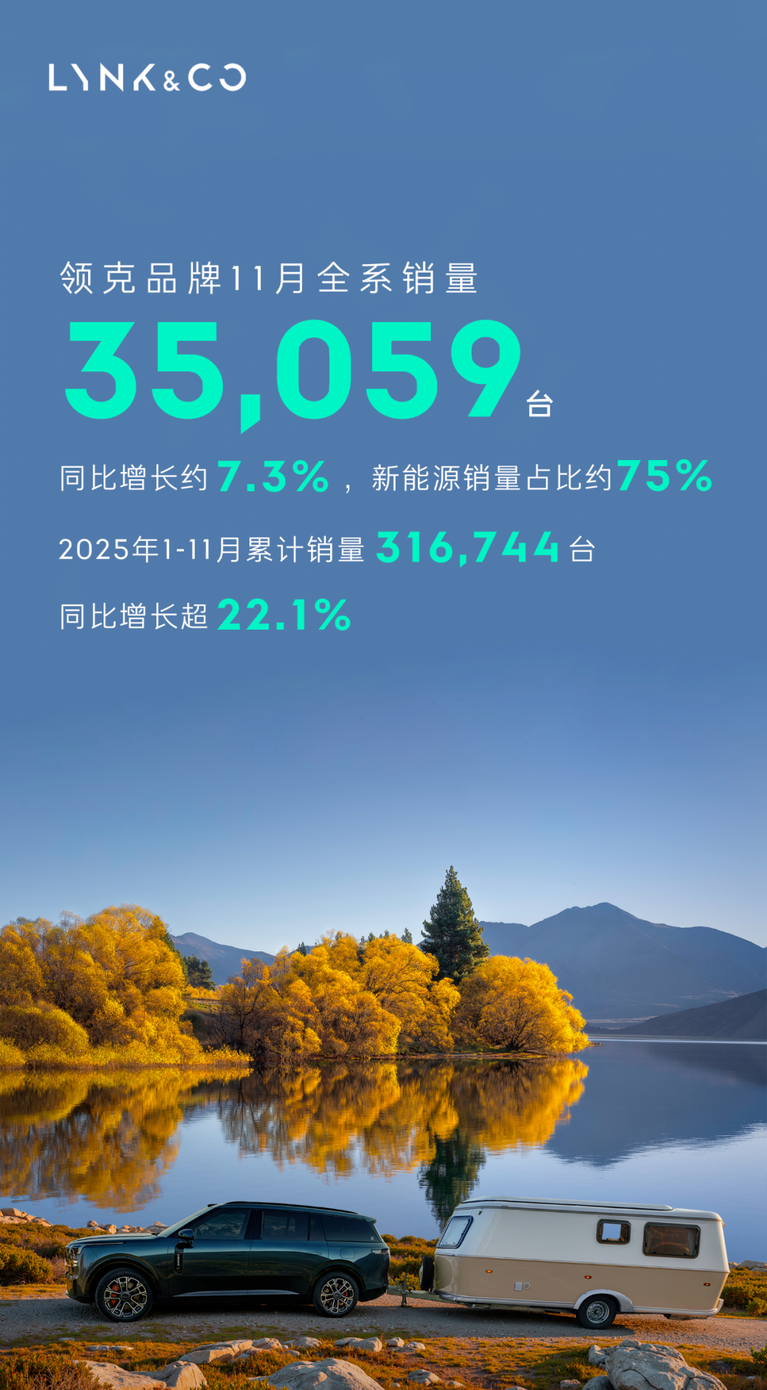 2025年11月,领克品牌全系销量35,059台,同比增长约7.3%。其中,领克新能源车型销量26,303台,占比约75%。 2025年1-11月,领克品牌全系累计销量316,744台,同比增长超22.1%。领克品牌历史累计销量1,653,026台。