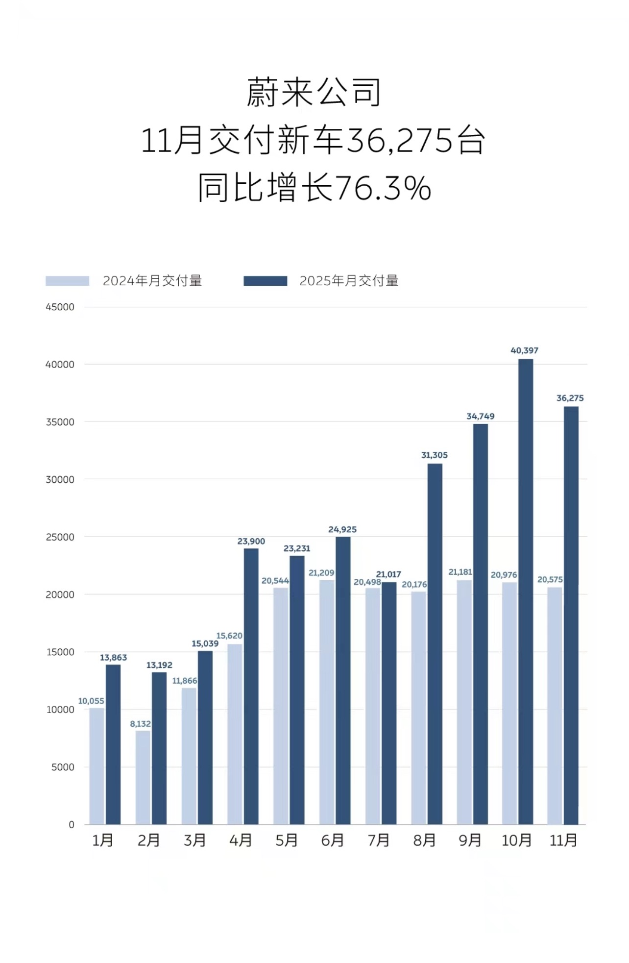 2025年11月,蔚来公司交付新车36,275台,同比增长76.3%。其中,蔚来品牌交付新车18,393台;乐道品牌交付新车11,794台;firefly萤火虫品牌交付新车6,088台。截至目前,蔚来公司已累计交付新车949,457台。其中,蔚来品牌累计交付新车797,712台;乐道品牌累计交付新车119,415台;firefly萤火虫品牌累计交付新车32,330台。