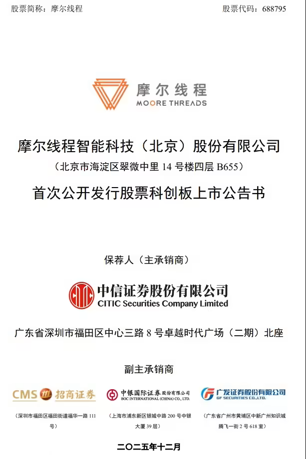 经上海证券交易所审核同意,摩尔线程智能科技(北京)股份有限公司发行的人民币普通股股票将于 2025 年 12 月 5 日在上海证券交易所科创板上市,证券代码为“688795”。