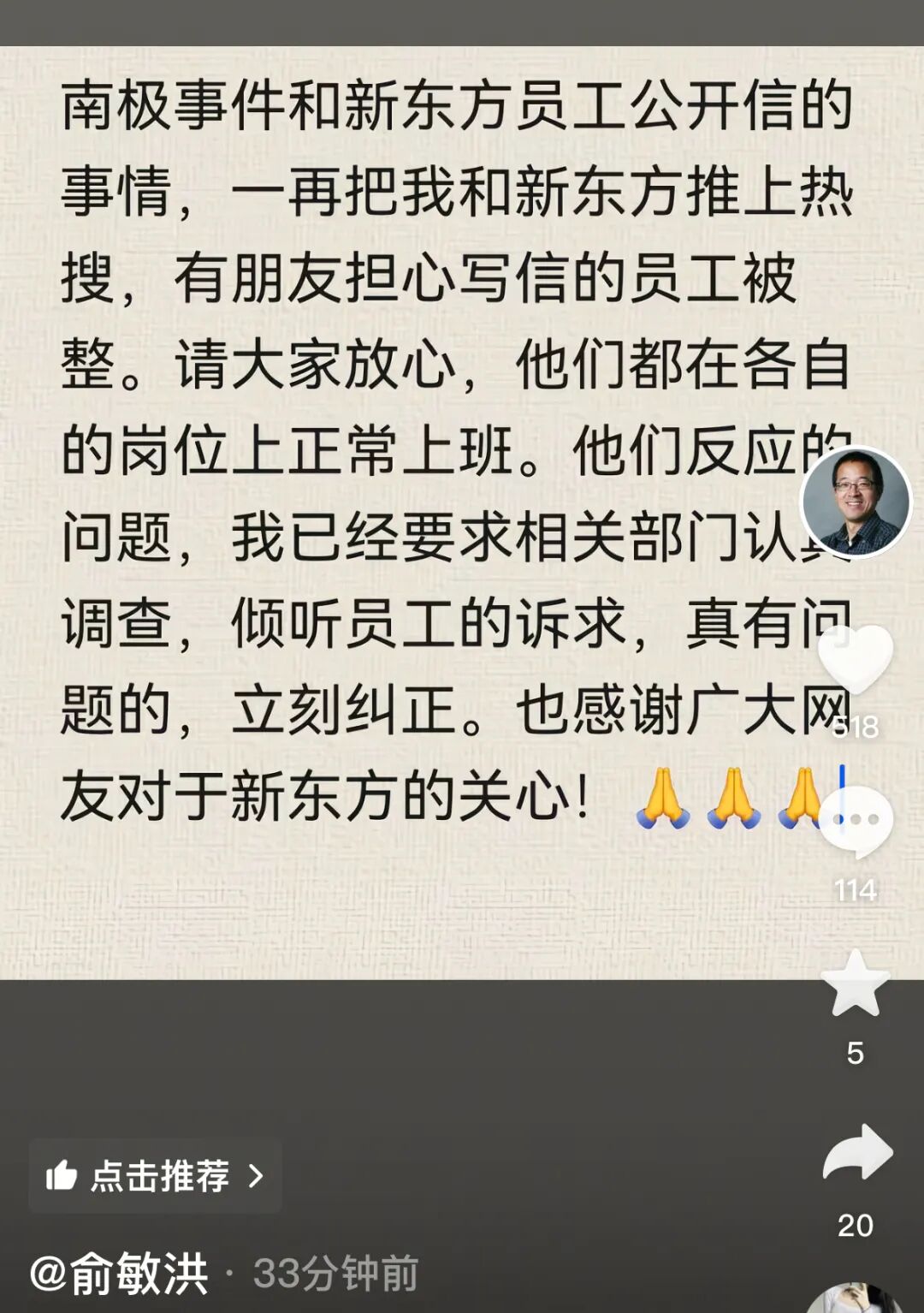 12月6日,新东方创始人俞敏洪发文:“南极事件和新东方员工公开信的事情,一再把我和新东方推上热搜,有朋友担心写信的员工被整。请大家放心,他们都在各自的岗位上正常上班。他们反映的问题,我已经要求相关部门认真调查,倾听员工的诉求,真有问题的,立刻纠正。”