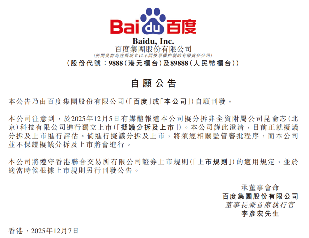 百度集团公告,公司注意到于2025年12月5日有媒体报道公司拟分拆非全资附属公司昆仑芯(北京)科技有限公司进行独立上市。公司澄清目前正就拟议分拆及上市进行评估。若进行分拆及上市,将须经相关监管审批程序,而公司并不保证分拆及上市将会进行。