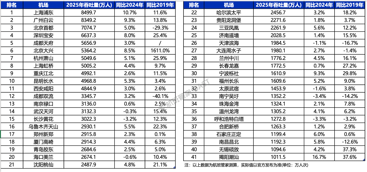 航班管家数据显示,2025全年我国预计共有41座机场旅客吞吐量超一千万人次(境内机场、不含港澳台),揭阳潮汕机场首进榜单。上海浦东排名第一,其次是广州白云,两者皆超过8300万人次,同比来看预计有7座机场出现轻微下滑,24座机场有不同程度增长,揭阳潮汕+16.7%、上海浦东+10.7%、宁波栎社+9.3%增幅靠前。