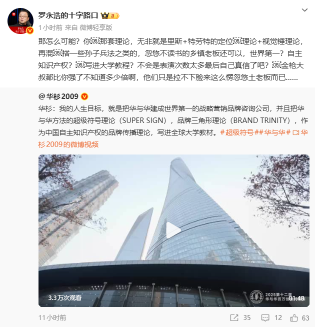 罗永浩转发华杉微博并表示,华杉那套理论,无非就是里斯+特劳特的定位理论+视觉锤理论,再混搭一些孙子兵法之类,“忽悠不读书的乡镇老板还可以,世界第一?自主知识产权?写进大学教程?不会是表演次数太多最后自己真信了吧?金枪大叔都比你强了不知道多少倍啊,他们只是拉不下脸来这么愣忽悠土老板而已……”