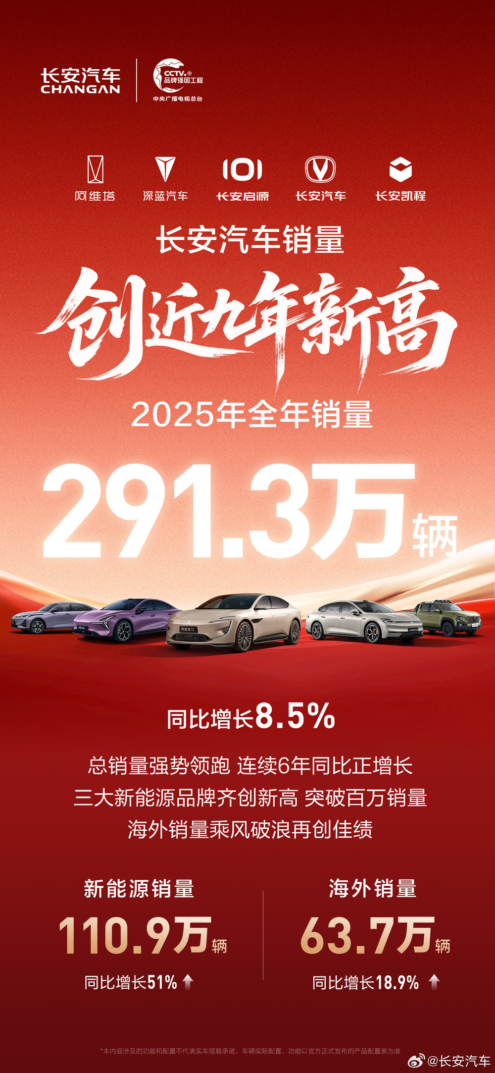 长安汽车 2025 年全年销量 291.3 万辆,同比增长 8.5%,创近九年新高,其中新能源销量 110.9 万辆,同比增长 51%。海外销量 63.7 万辆,同比增长 18.9%。