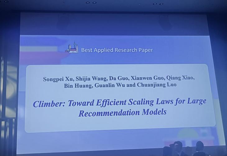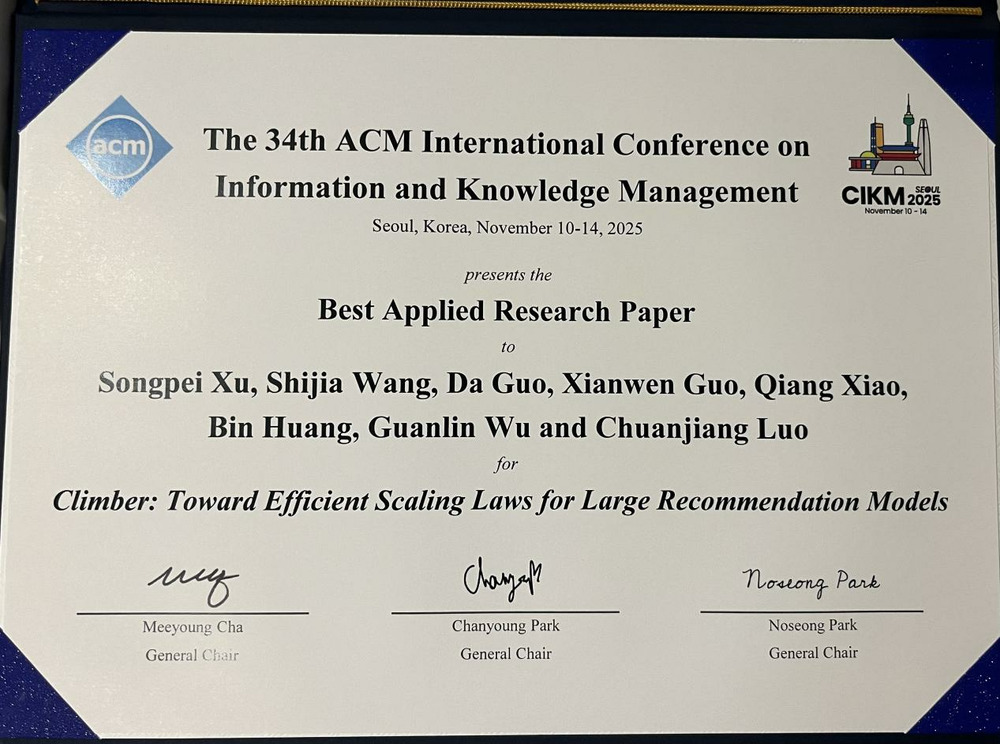 当日,韩国首尔,CIKM 2025颁奖典礼现场,网易云音乐算法团队凭借生成式推荐大模型Climber荣获大会“Best Applied Paper Award”最佳论文奖,获奖概率不到千分之三。该奖项评选标准极严,需经全球顶尖学者多轮评议,要求论文在理论深度、技术创新、实验严谨、写作质量及产业落地等维度全面领先。今年与网易云音乐同台竞技者包括Google、Amazon、Meta、Microsoft、Airbnb、字节、腾讯、阿里、快手等全球科技巨头,以及MIT、Stanford、CMU、清华、北大等世界顶尖高校,竞争异常激烈。