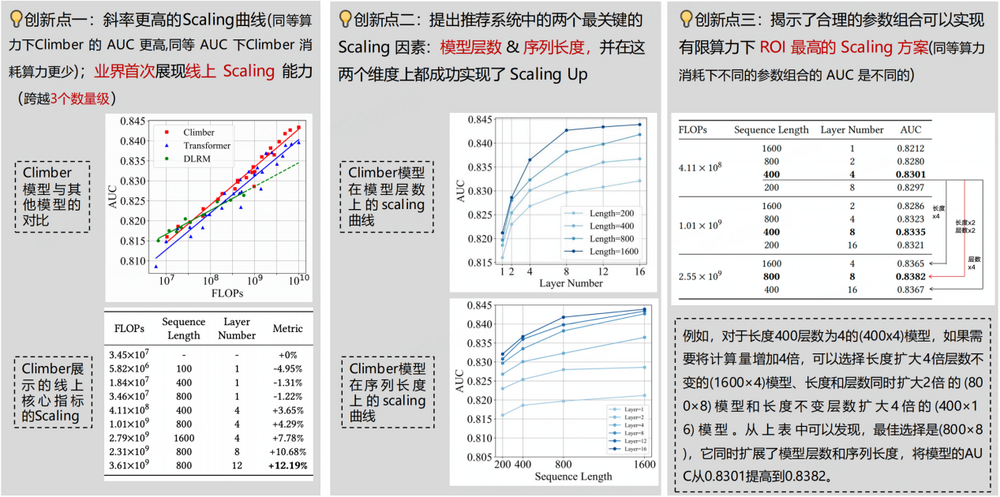 另外,“Climber”还同时从“架构设计-加速技术-资源分配”三个层面协同优化,让推荐模型既能“变大”(捕捉更多信息),又能“跑快”(控制资源消耗)。而此前,行业内的解决方案存在明显短板,没有形成“效果-效率”双优的闭环,无法满足工业级推荐“大”和“快”兼备的需求。